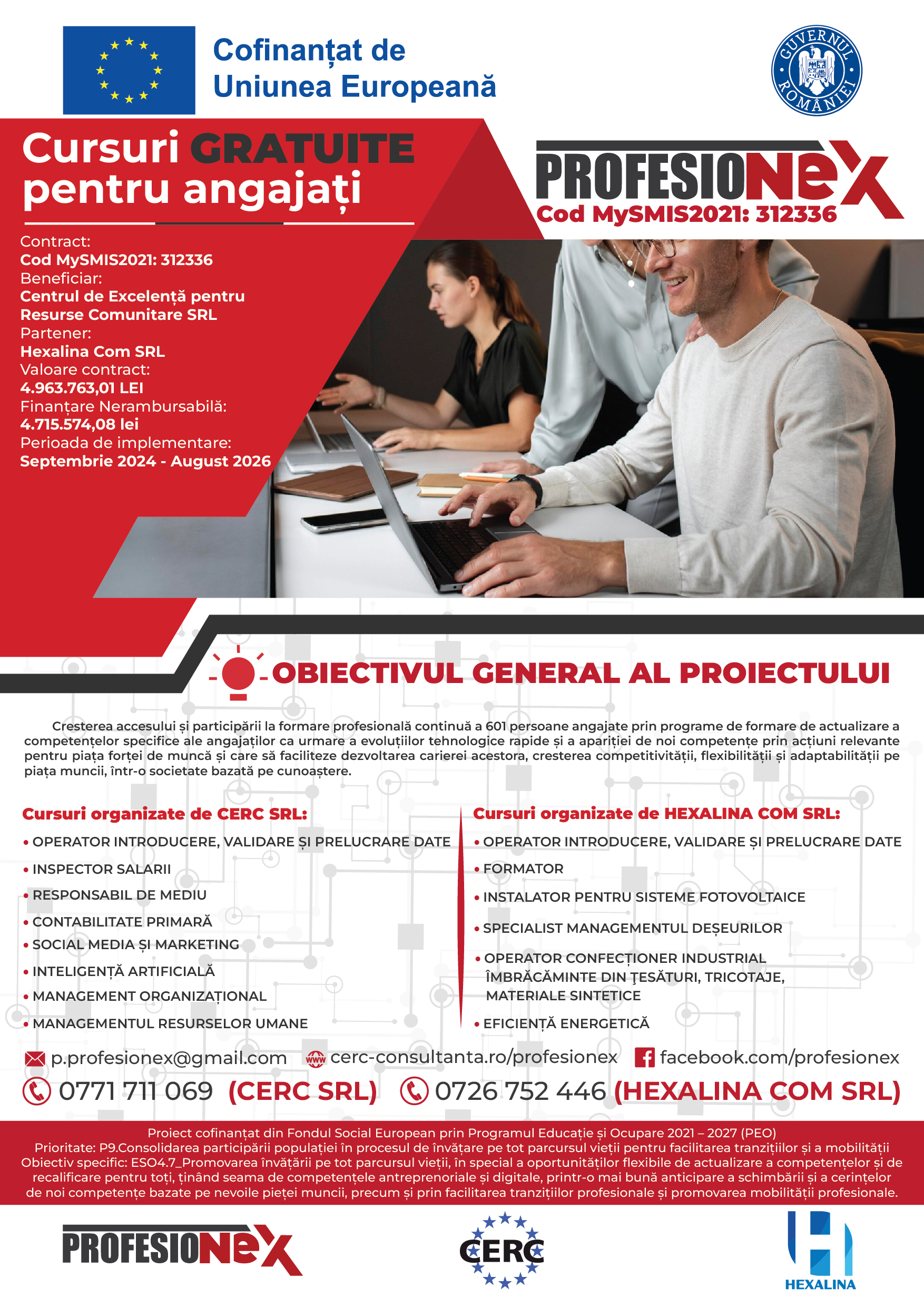 Centrul de Excelență pentru Resurse Comunitare SRL, în calitate de Lider/Beneficiar, în parteneriat cu HEXALINA COM SRL, anunță lansarea proiectului „ProfesioNex”, ID MySMIS 312336, începând cu luna septembrie 2024.